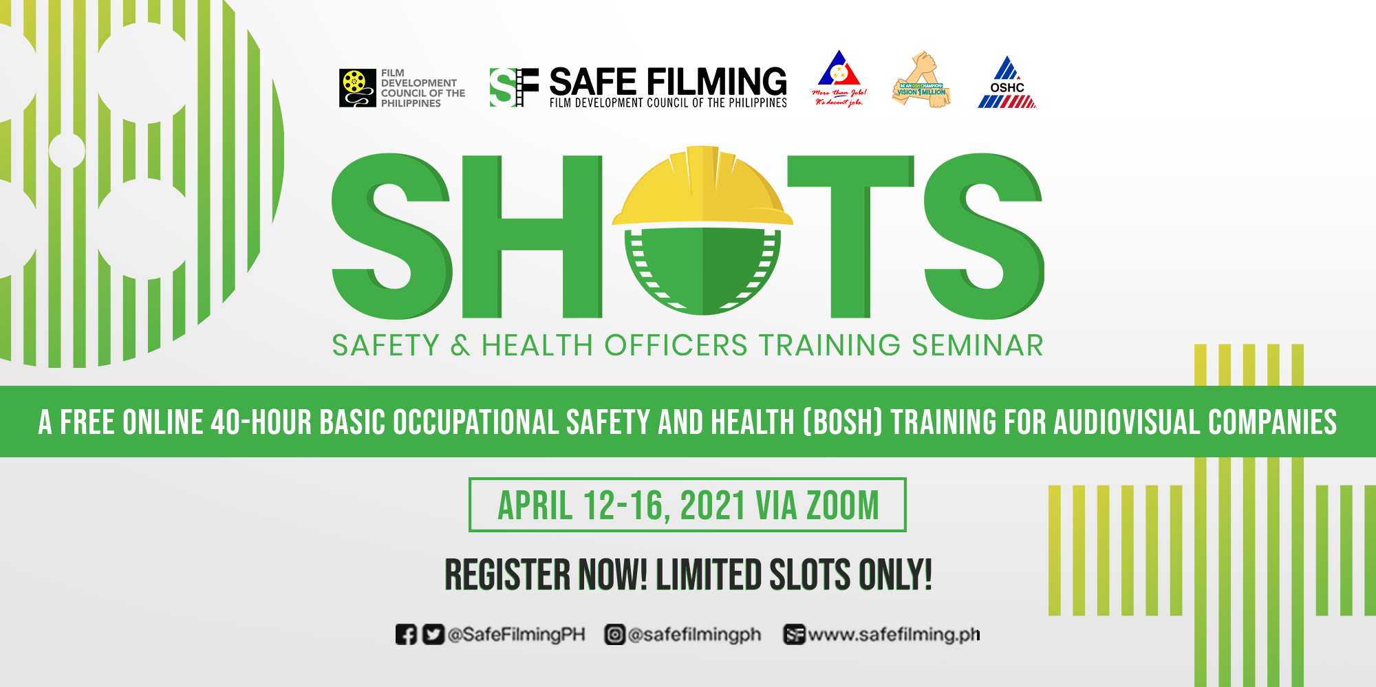 The Safety and Health Officers Training Seminar (SHOTS) is a free online 40-hour BOSH Training for audiovisual companies that will be held from April 12 to 16 via Zoom with a 8 a.m. to 5 p.m. daily schedule.