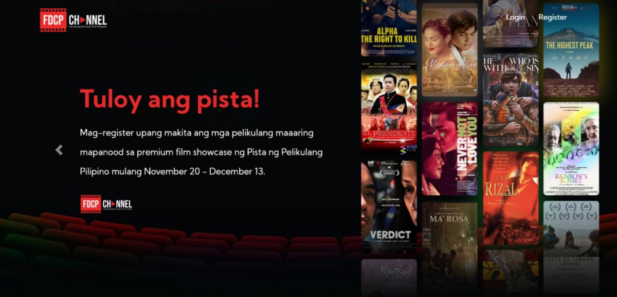 The FDCP Channel (fdcpchannel.ph) is the digital platform for the ongoing 4th Pista ng Pelikulang Pilipino that has 170 films.