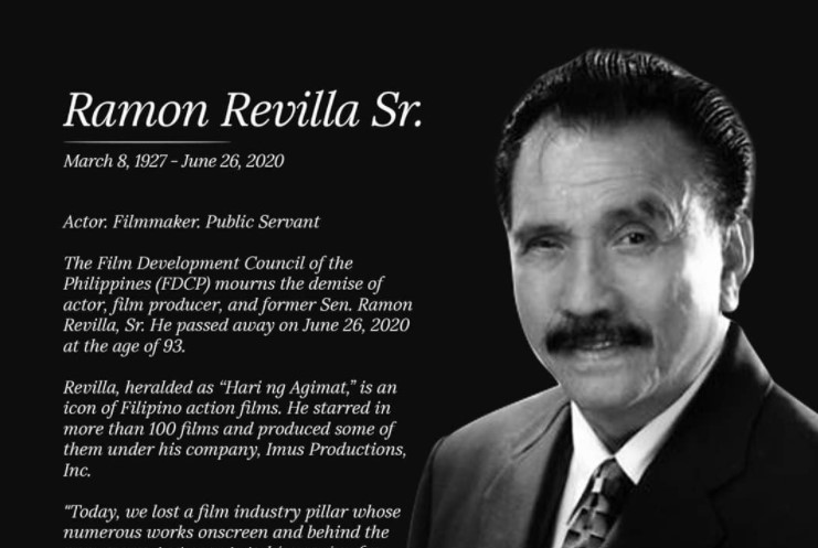 The Film Development Council of the Philippines (FDCP) mourns the demise of actor, film producer, and former Sen. Ramon Revilla, Sr. He passed away on June 26, 2020 at the age of 93.
