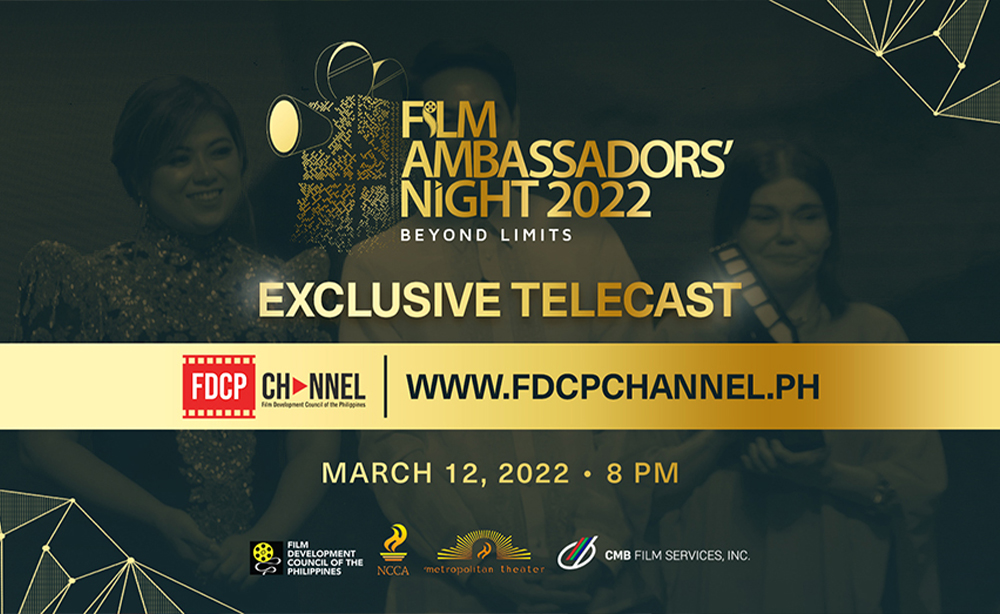 MANILA, PHILIPPINES, MARCH 10, 2022— After the success of recently concluded Film Ambassadors’ Night presented by the Film Development Council of the Philippines (FDCP) last February 27 at the historic Metropolitan Theater, the full show’s telecast will be streamed on the FDCP Channel (https://fdcpchannel.ph/) for a free one-time access on March 12, 2022, Saturday, at 8:00 PM.