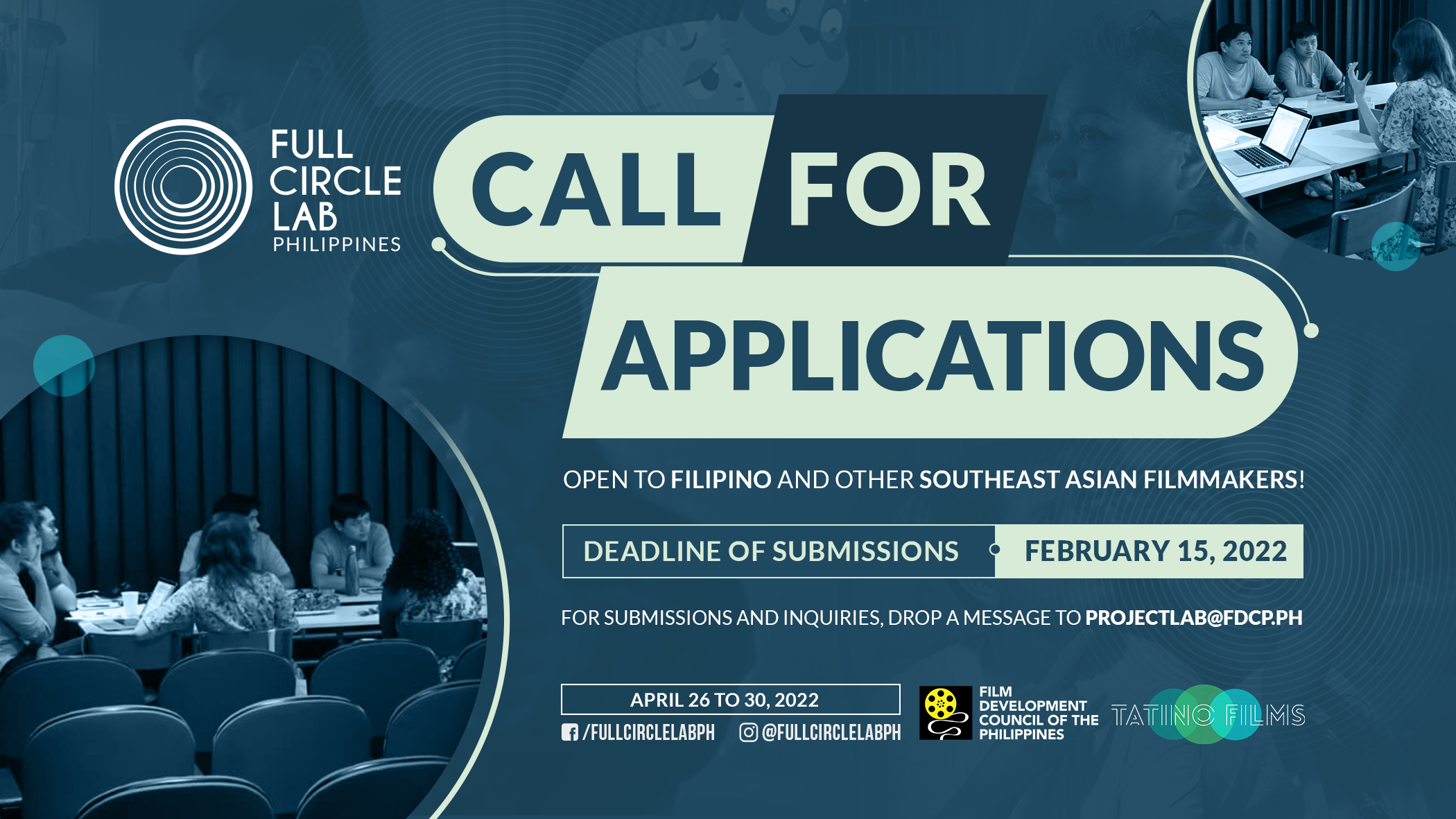 Eligible applicants may submit the complete application package consisting of complete requirements and accomplished application form to [email protected] with the subject: Full Circle Lab Philippines 2022 [Lab Category Application] ex. Full Circle Lab Philippines 2021 [Fiction lab Application]. Applications for Fiction Lab, Creative Producers Lab, and Story Editing Lab will be accepted until February 15, 2022 with announcement of selected participants in the FCL PH’s social media pages on March 15, 2022. The application period for First Cut Lab will be until March 15, 2022, announcement date of chosen projects will be posted this month. Interested applicants may download the application form here: https://bit.ly/FCLPH2022-ApplicationForm.