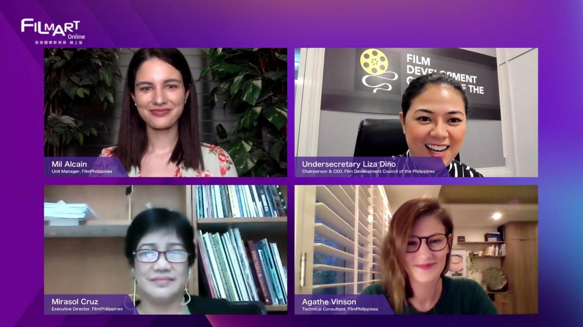 (Clockwise from top left) FilmPhilippines Incentives Unit Manager Mil Alcain, FDCP Chairperson and CEO Liza Diño, FilmPhilippines Technical Consultant Agathe Vinson, and FilmPhilippines Executive Director Mirasol Cruz at the 2021 HK FILMART.