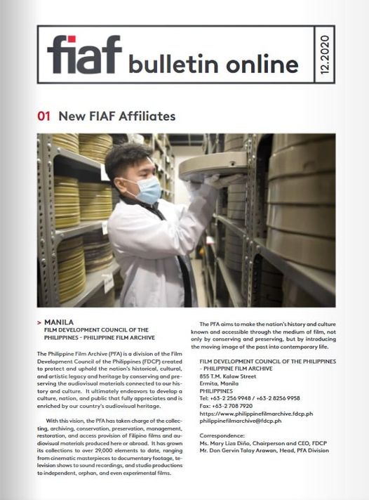 On the latest FIAF Bulletin Online, the Philippine Film Archive is the newest FIAF Affiliate!